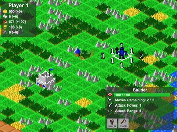 The builder can collect resources and use them to construct buildings. Each building type can only be built on certain types of tiles, which will be highlighted near the builder if one is nearby.